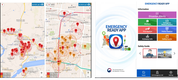 Emergency Ready, distributed by the Ministry of Interior and Safety, is an app targeted toward foreign residents and which provides useful information regarding emergency shelters, medical centers, fire stations, emergency medical centers, police stations, and safety guides.