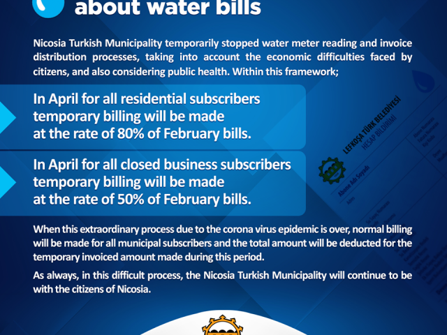 NicosiaTurkish Municipality  (NTM) Temporarily stopped water meter reading and invoice distribution processesTaking into account the economic difficulties faced by citizens, and also considering public health. After the World Health Organization stated that the Covid-19 virus as pandemic and the partialcur few was made by the government, the Mayor of NTM Mehmet Harmancı stated that the amount of water usage has increased significantly due to the citizens spending more time in their homes for more than two weeks. Despite this picture, he emphasized that in April for all residential subscribers temporary billing will be made at the rate of 80% of February bill sand for all closed business subscribers temporary billing will be made at the rate of 50% of February bills.