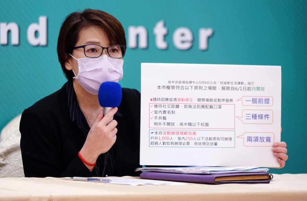 Başkan Yardımcısı Huang Shan-shan 25 Mayıs tarihinde gerçekleştirdiği basın toplantısında kısıtlamaların gevşetilmesi ve ilerleyen zamanlarda bir çok mekânın yeniden açılması ile ilgili genel esasları açıkladı. Bunlar; sosyal mesafenin korunması, kapalı alan aktivitelerinde gerçek isim kaydı alınması, toplu yemekler düzenlenmemesidir.